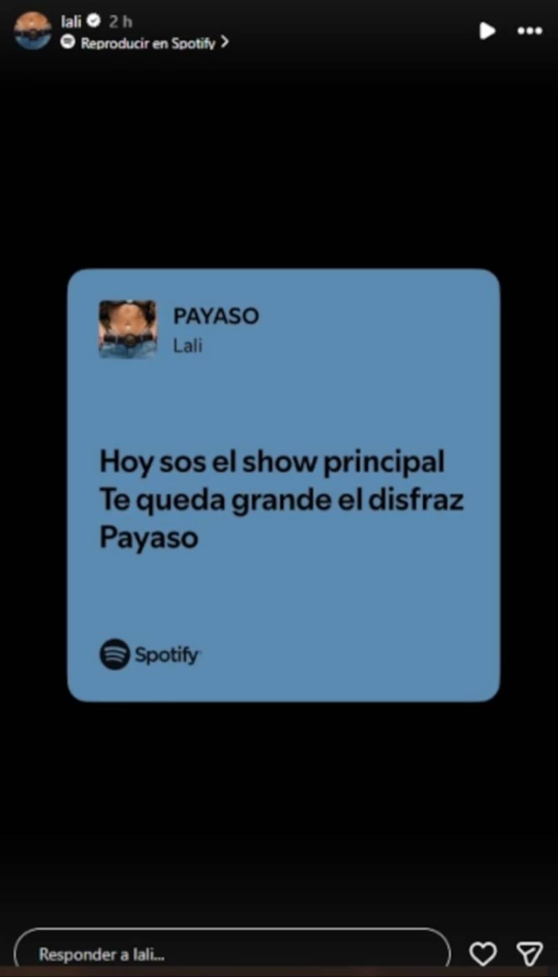 Sin mencionarlo de manera directa, la cantante y actriz utilizó sus historias de Instagram para manifestar su postura. En primer lugar, compartió un fragmento de “Payaso”, la canción que le dedicó al jefe de Estado, cuya letra incluye la frase: “Hoy sos el show principal, te queda grande el disfraz, payaso”.