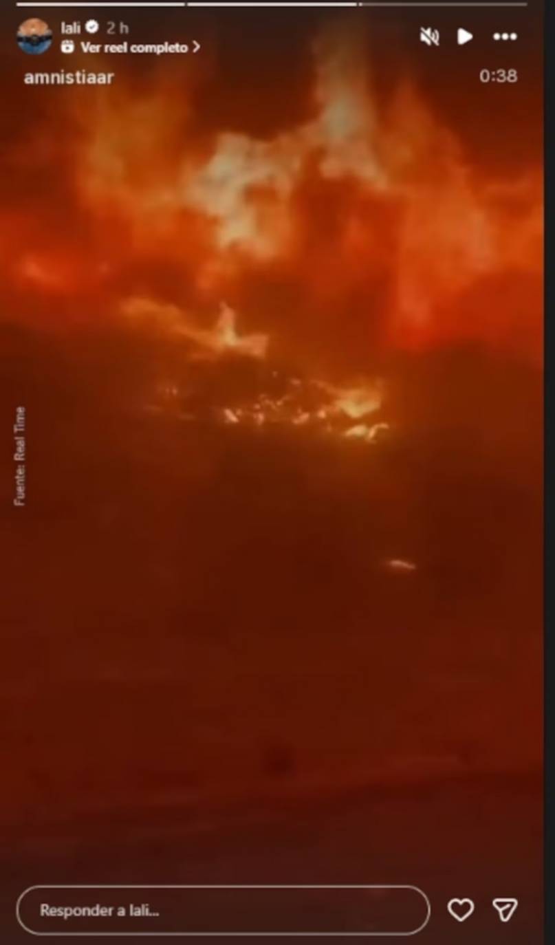Minutos más tarde, Espósito reforzó su mensaje con una segunda publicación de tono político y social, donde compartió una historia de amnistiar en la que se hacía referencia a los incendios que afectan al sur del país. “La Patagonia y tus derechos arden. El Estado no responde. Exigimos prevención, recursos y acción urgente”, expresaba el texto compartido por la artista.