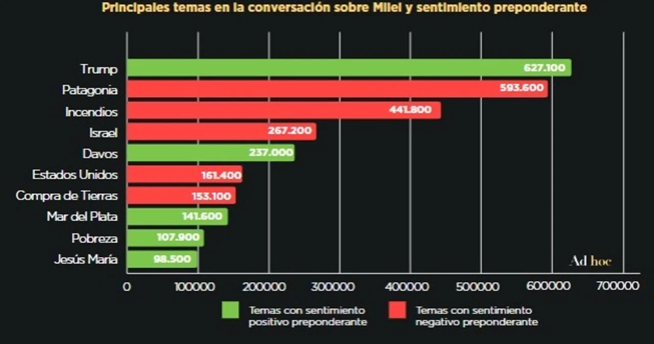 Así, su vínculo con Trump, la presencia en Davos y el Tour de la Gratitud en Mar del Plata, y su participación en el Festival de Doma y Folklore de Jesús María son los tópicos positivos en los que fue nombrado Milei.