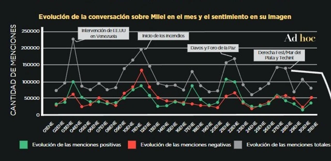 Según la consultora Ad Hoc, el “sentimiento digital positivo” durante el primer mes del año se registró en torno al 47% y se refleja en menciones vinculadas a las celebraciones del secuestro de Nicolás Maduro en Venezuela, llevado adelante por el gobierno Donald Trump, y su vínculo con Estados Unidos.