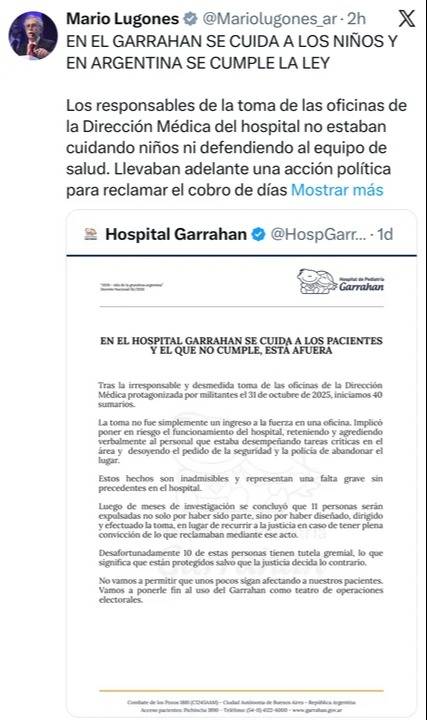 Y destacó que “mientras algunos vienen hace meses intentando obstaculizar las tareas del hospital, el Garrahan sigue creciendo: realiza cirugías de alta complejidad, recibe a niños de todo el país y fortalece su rol como hospital pediátrico de referencia en la región”. (NA)
