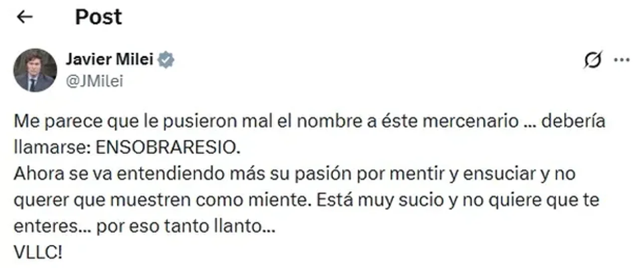 “Me parece que le pusieron mal el nombre a este mercenario… debería llamarse ENSOBRARESIO”, escribió Milei, utilizando un juego de palabras para insinuar que el periodista recibiría beneficios o pautas espurias. Según el posteo presidencial, la postura crítica de Novaresio estaría motivada por una supuesta “pasión por mentir y ensuciar” con el objetivo de ocultar su falta de transparencia.