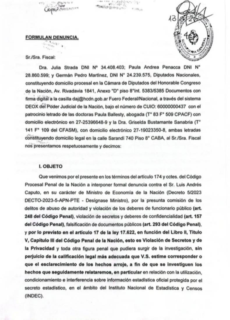 La presentación fue realizada por los diputados de Unión por la Patria (UxP) Julia Strada, Germán Martínez y Paula Penacca, quienes apuntaron al titular del Palacio de Hacienda.
