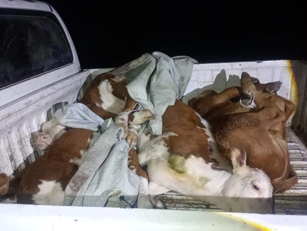 Al inspeccionar la caja de la camioneta, los efectivos encontraron cuatro terneros de aproximadamente 100 kilos cada uno, maniatados para evitar que escaparan. Tras el choque, el conductor confesó que los animales habían sido robados y que pertenecían a su propio empleador.