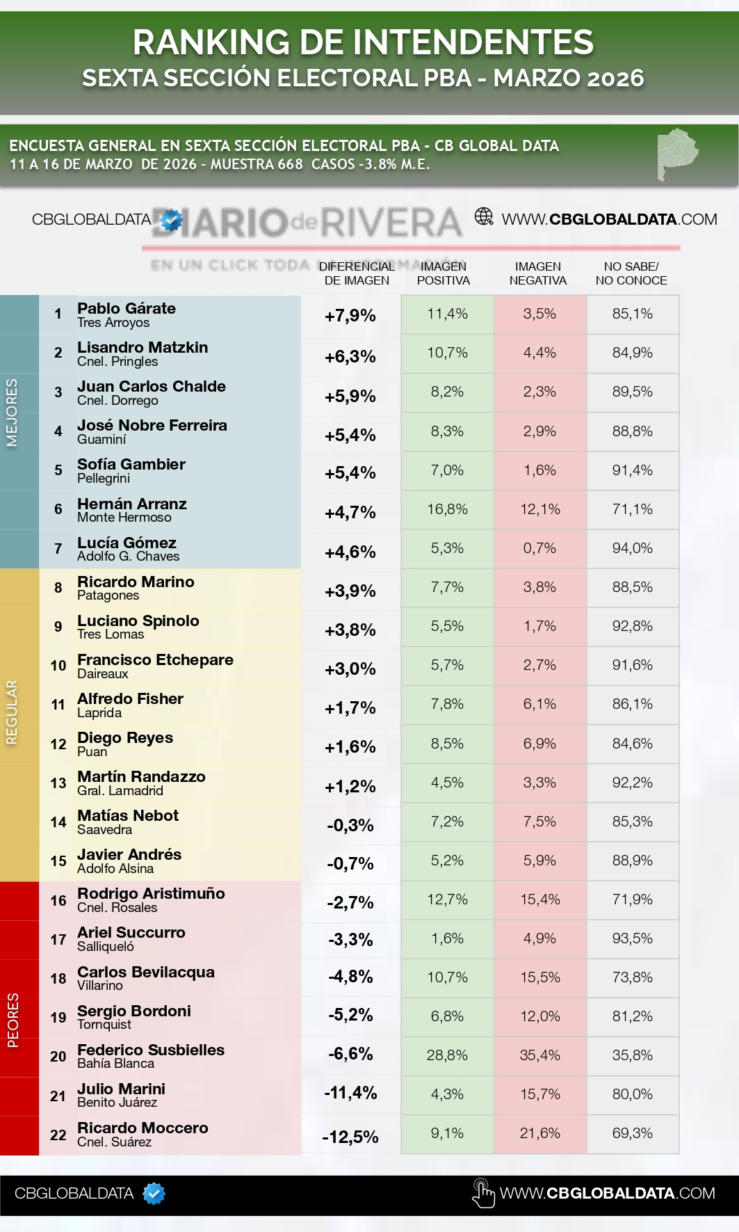 El ranking es liderado por el intendente de Tres Arroyos, Pablo Garate, con un diferencial positivo del 7,9%, seguido por Lisandro Matzkin (Coronel Pringles) con 6,3% y Juan Carlos Chalde (Coronel Dorrego) con 5,9%.