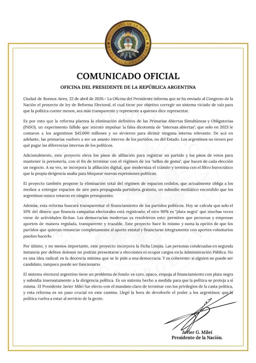 El Gobierno presentó este miércoles el proyecto de ley para tratar la reforma electoral en la Cámara de Senadores. El presidente Javier Milei anunció ayer desde Israel que mandarían la iniciativa con el objetivo de eliminar las PASO, cambiar el financiamiento e incluir Ficha Limpia.