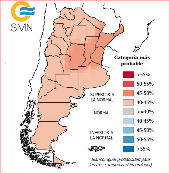 En tanto, para el norte del país, el NOA, la región de Cuyo, la provincia de Buenos Aires, La Pampa y la Patagonia, el pronóstico indica una situación “normal o superior a la normal”. Es decir, si bien no se descarta cierta variabilidad, predominan las probabilidades de registros térmicos por encima de los valores históricos.
