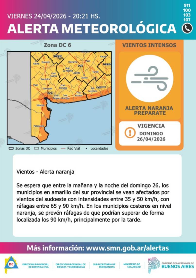 Sin embargo, el escenario se intensificará hacia la tarde, cuando el nivel de advertencia escale a alerta naranja en la franja costera. En ese período se prevén vientos de entre 50 y 70 km/h, con ráfagas superiores a los 100 km/h, especialmente en sectores cercanos al mar como Bahía Blanca y Monte Hermoso, aunque también impactará en distritos del interior como Tornquist, Coronel Suárez, Puan, Saavedra y Pringles.