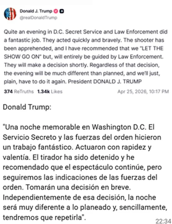 Minutos después de la evacuación, Trump escribió en su red Truth Social que había sido “una noche intensa” en la capital y elogió la respuesta de las fuerzas de seguridad. Confirmó que el tirador fue detenido y señaló que recomendó que “el espectáculo continúe”, aunque aclaró que seguiría las indicaciones de las autoridades, que evaluarían los próximos pasos.